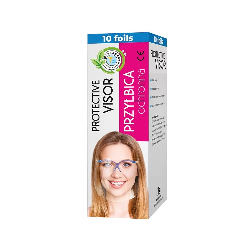 Wyjątkowo wygodne i lekkie przyłbice marki Cerkamed, zaprojektowane z myślą o osobach noszących okulary, dostępne w opakowaniu wraz z 10 wymiennymi foliami.