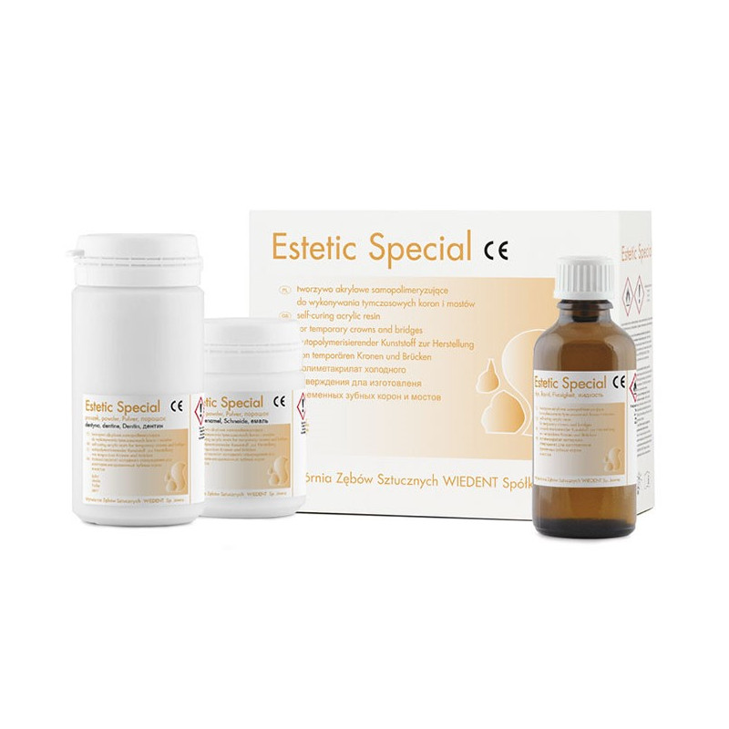 Tworzywo akrylowe szybkopolimeryzujące przeznaczone do wykonywania czasowych koron i mostów w 8 odcieniach barwnych imitujących naturalny kolor zębów.