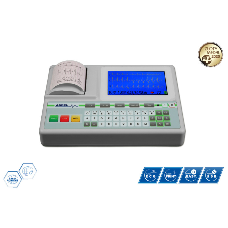 Elektrokardiograf ASPEL ECG GREEN v.06.101 - Najlepszy elektrokardiograf w swojej klasie, łączący w sobie jakość i nowoczesny design. Kolorowy wyświetlacz graficzny LCD z ekranem dotykowym, niewielkie wymiary, komunikacja z komputerem oraz wewnętrzna baza pacjentów i badań - to najważniejsze cechy tego wyjątkowego aparatu EKG, zbudowanego z wykorzystaniem technologii mikroprocesorowej. Umożliwia on wykonywanie badań w pełnym zakresie 12 odprowadzeń i jest wyposażony w moduł automatycznej analizy i interpretacji. Przeznaczony jest do wykonywania badań EKG dorosłych i dzieci w celu wyszukiwania nieprawidłowości kardiologicznych, wykrywania niedokrwienia mięśnia sercowego bądź zawału. Aparat przeznaczony jest do użycia we wszystkich placówkach służby zdrowia przez przeszkolony personel.
