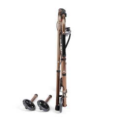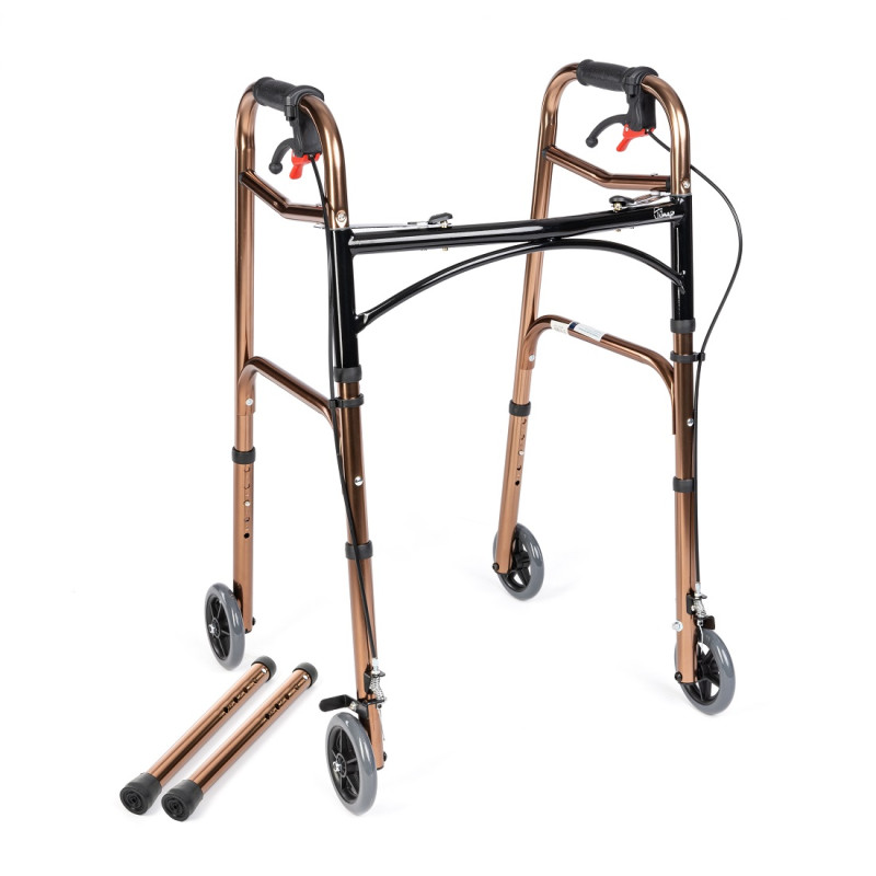 Balkonik czterokołowy z hamulcami JMC-C 3223 firmy Timago wykonany jest ze wzmocnionej poprzecznie aluminiowej ramy. Wyposażony jest w przednie nóżki z pełnymi kołami o średnicy 13cm, hamulce ręczne, w tym również dodatkowe hamulce postojowe, oraz wymienne nóżki tylne (z kołami lub nasadkami). Solidne uchwyty zapewniają odpowiednią stabilizację i wygodę użytkowania. Wysokość balkonika może być dostosowana do wzrostu użytkownika. Po złożeniu balkonik zajmuje niewiele miejsca, dzięki czemu można go łatwo przechowywać i przewozić.