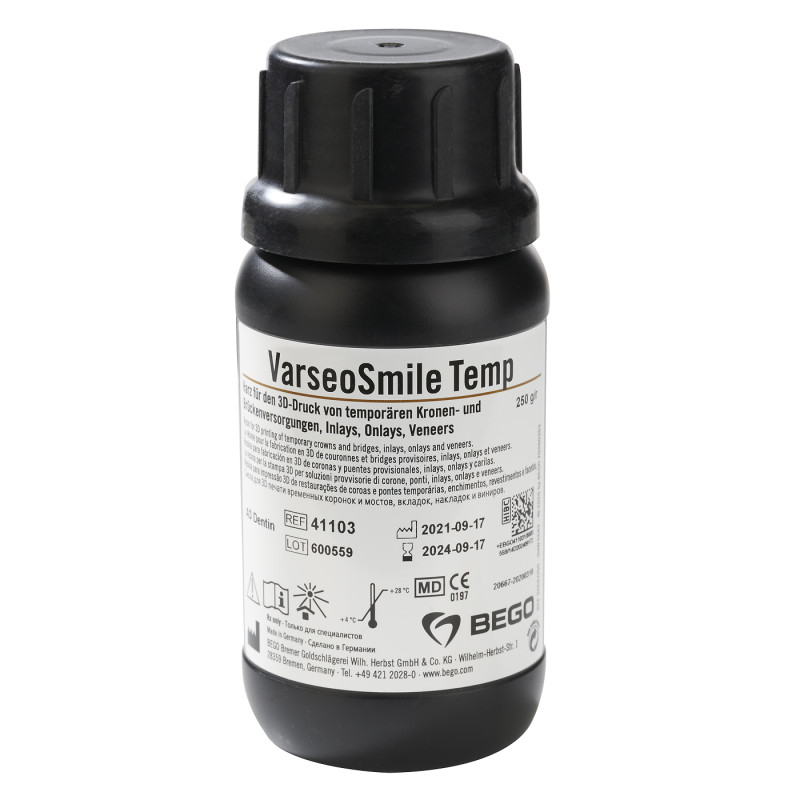 Dzięki wysokim parametrom elastyczności i wysokiej wytrzymałości oferuje pacjentom maksimum możliwego bezpieczeństwa. Parametry drukowania 3D specjalnie przeznaczone dla szyn umożliwiają szybką i ekonomiczną produkcję szyn w laboratorium. Wysoki poziom przezroczystości jest taki jak w przypadku szyn termoformowanych i stanowią bazę dla idealnego dopasowania i dokładności. Znak CE zapewnia bezpieczeństwo, wydajność i stałe monitorowanie VarseoSmile Temp a także zapewnia najwyższą jakość przy różnych partiach produktów. Biokompatybilność materiału potwierdzona przez niezależne instytuty zapewnia bezpieczeństwo dla pacjenta. VarseoSmile Temp spełnia wymogi dla produktu medycznego Klasy I (zgodnie z Dyrektywą 93/42/EEC)