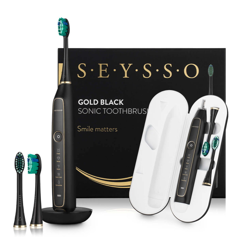 Ekskluzywna czarna szczoteczka soniczna do zębów z nowej serii SEYSSO Gold. Szczoteczka wyposażona jest w 5 trybów pracy. W zestawie znajdują się 3 końcówki wymienne oraz etui ładujące. Szczoteczka wykonuje do 96 000 ruchów sonicznych na minutę.