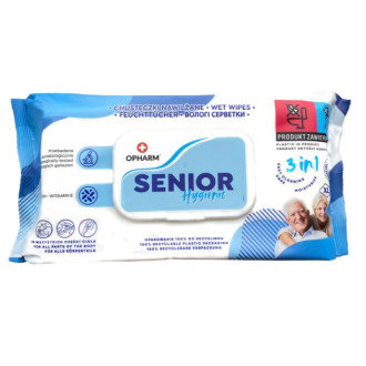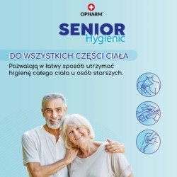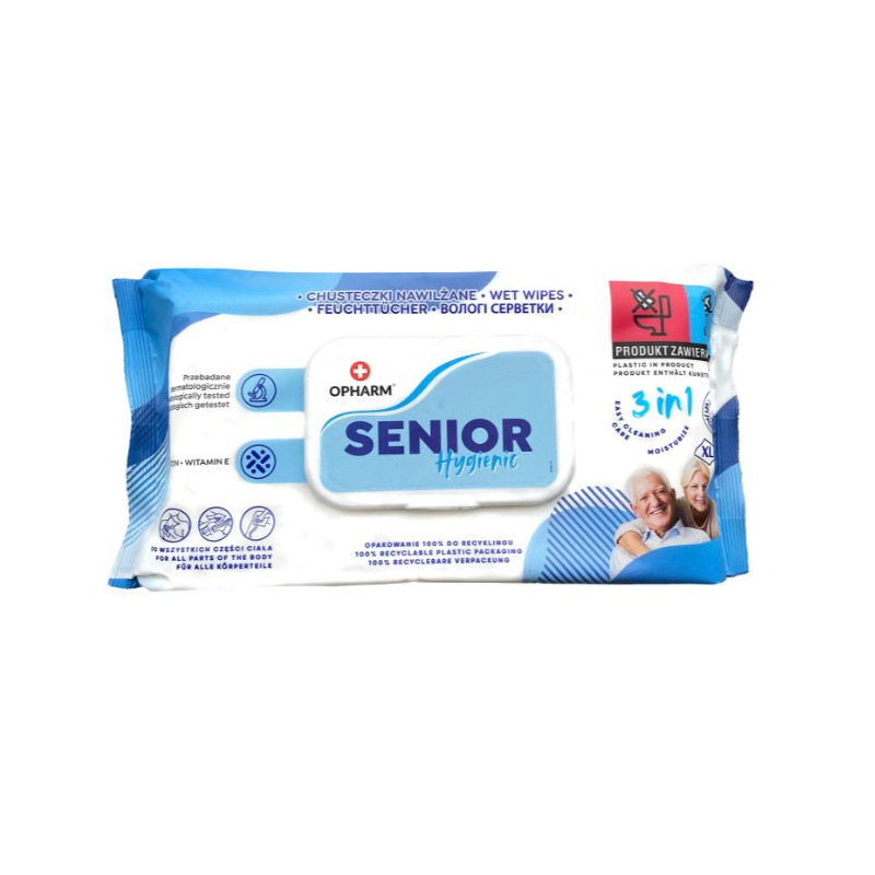 Opharm Senior Hygienic to chusteczki nawilżane do pielęgnacji osób starszych, obłożnie chorych i niepełnosprawnych. Pozwalają oczyścić i odświeżyć ciało bez użycia wody i mydła. Zawierają w składzie alantoinę, która nawilża i wspomaga regenerację naskórka oraz witaminę E, która dodatkowo natłuszcza, działa kojąco i ochronnie na skórę.