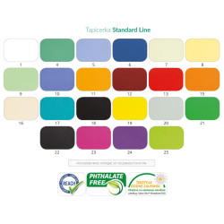 Materiał o zastosowaniu medycznym, winylowy o podwyższonej odporności na płyny ustrojowe. Posiada odporny na pleśń podkład i warstwę wierzchnią. Posiada antystatyczne wykończenie. Materiał może być stosowany w wyposażeniu przeznaczonym dla dzieci.