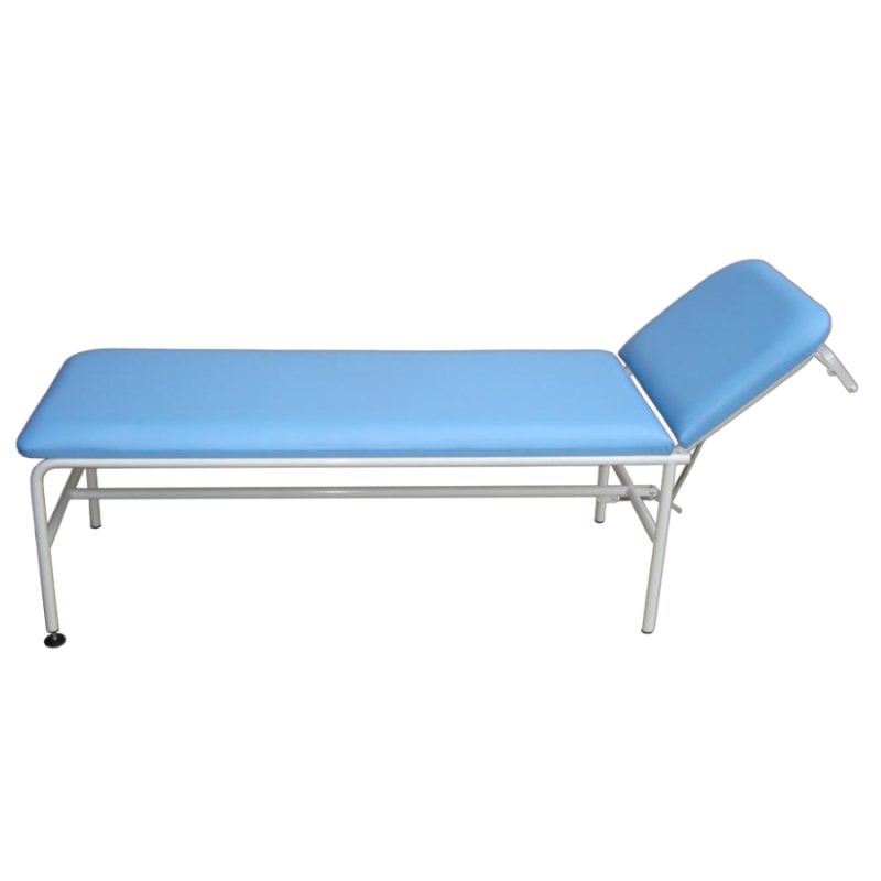 Kozetka lekarska o stałej wysokości 52 cm na stabilnym stelażu wykonanym z profili stalowych o przekroju rurki pokrytych białym lakierem proszkowym odpornym na promieniowanie UV.