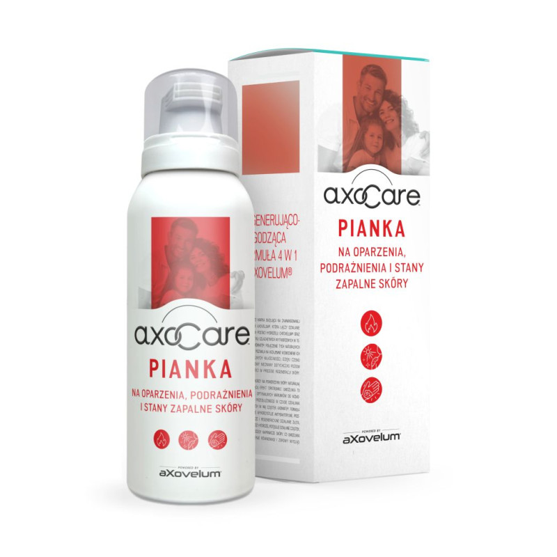 Pianka AXOCARE™ bazuje na innowacyjnej formule aXovelum®, łączącej działanie chitozanu oraz cząstek metali szlachetnych aXonnite®. Tworzy na powierzchni uszkodzonej skóry naturalną błonę, która zapewnia intensywne i trwałe działanie odbudowujące skórę. Hydrożelowa formuła wzmacnia antybakteryjne właściwości srebra, regenerujące złota i przeciwgrzybicze miedzi. Chroni uszkodzoną skórę przed wtórnym zakażeniem. Przeznaczona do regeneracji podrażnionej skórę oraz do zmniejszenia zaczerwienienia. Formuła stworzona, aby przywracać elastyczność oraz niwelować uczucie ściągania i napięcia skóry. Składniki preparatu wykazują działanie przeciwzapalne i łagodzące ból.