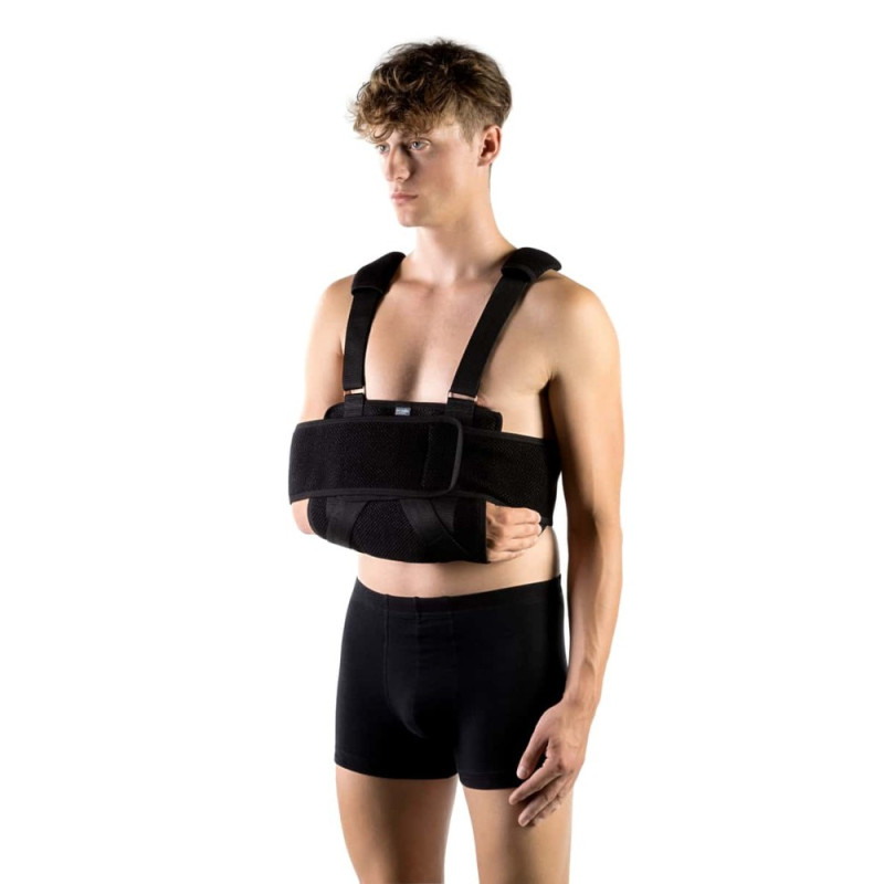 Kończynę górną należy umieścić w kieszeni ortezy, taśmy nośne krzyżuje się z tyłu na plecach, a następnie zapina z przodu na rzep. Pas stabilizujący należy poprowadzić dookoła tułowia i zapiąć tak aby rękę unieruchomić. Regulacja taśm nośnych umożliwia indywidualne dopasowanie.