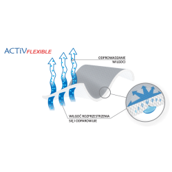 Orteza uda należy do grupy ULTRA BREATHING, została wykonana techniką bezszwową z innowacyjnego surowca ACTIV FLEXIBLE. Zastosowane surowce i sposób ich działania spowodowały uzyskanie właściwej dla ortez ortopedycznych grubości materiału oraz właściwą kompresję zabezpieczonej części ciała. Cel ten został zrealizowany poprzez zastosowanie w produkcji dzianiny technik dziewiarskich 3D, odpowie-dnich splotów oczek, elastycznego surowca i przędzy ze specjalnymi oplotami. Jako włókno podstawowe zastosowano poliester z jonami srebra, ponieważ to on zapewnia najszybsze odprowadzanie wilgoci i skuteczną ochronę skóry przed bakteriami i powstawaniem przykrego zapachu potu. Tam gdzie jest to absolutnie konieczne, poliester występuje również w kombinacji z elastanem, dla zwiększenia elastyczności wyrobu i lepszego dopasowania do stawu.