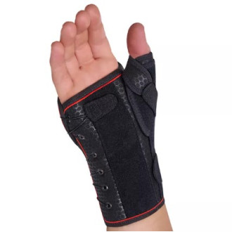 Zapięcie na sznurówki dociągowe, wklejki anytpoślizgowe zapobiegają obracaniu się ortezy na ręce.