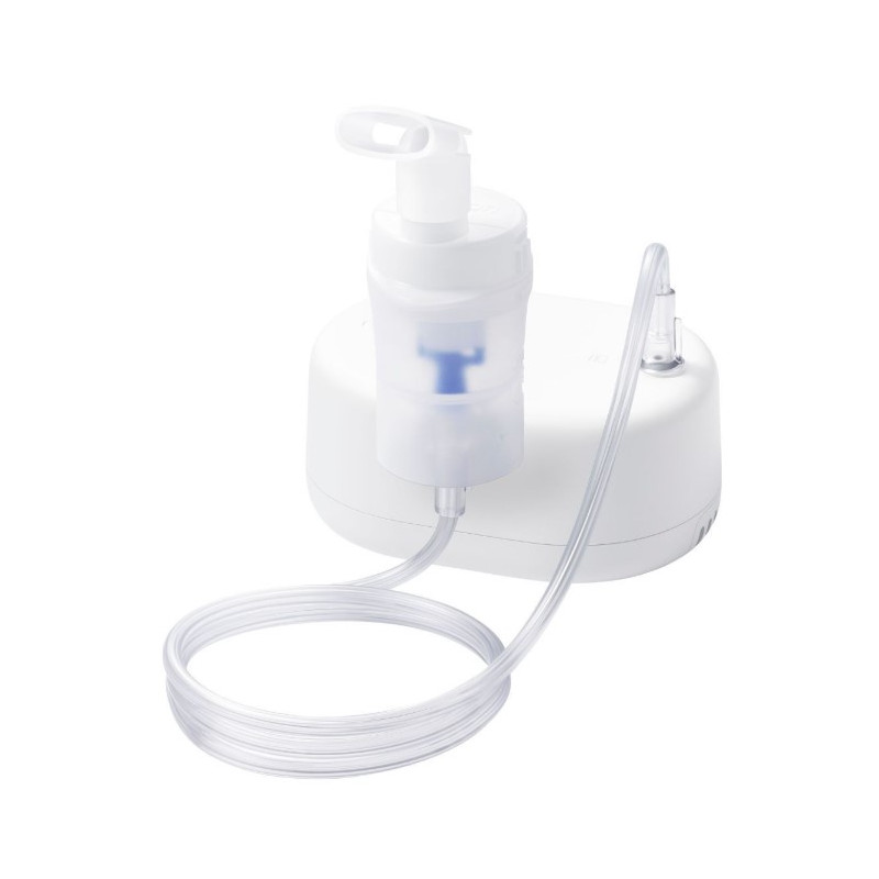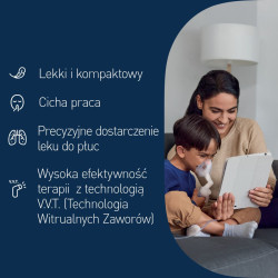 Wyposażony w nowoczesny nebulizator z systemem zaworów, zapewnia skuteczne podawanie leku, minimalizując jego straty i zwiększając efektywność terapii. Pojemnik na lek z podziałką ułatwia prawidłowe dawkowanie, a praktyczny uchwyt na nebulizator pozwala wygodnie przechowywać zestaw w obudowie kompresora.