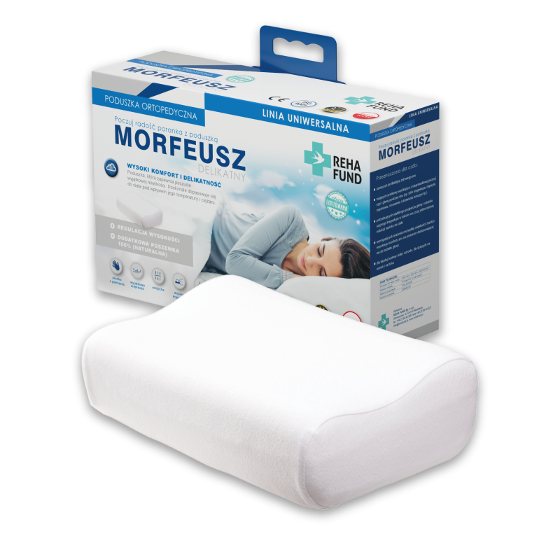 „Morfeusz delikatny” firmy Rehafund to specjalistyczna poduszka ortopedyczna, która ma za zadanie zapewnić prawidłowe podparcie głowy i ułożenie kręgosłupa szyjnego w trakcie snu.