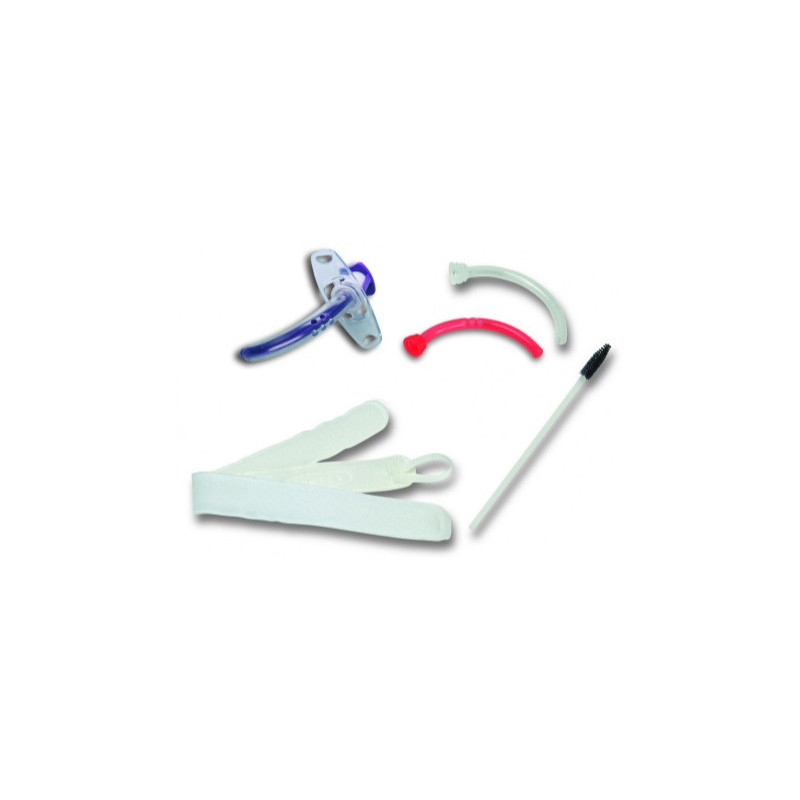 Rurka tracheostomijna bez mankietu, fenestracyjna, z wymiennymi kaniulami i szczoteczką do czyszczenia kaniul i opaską do rurki.