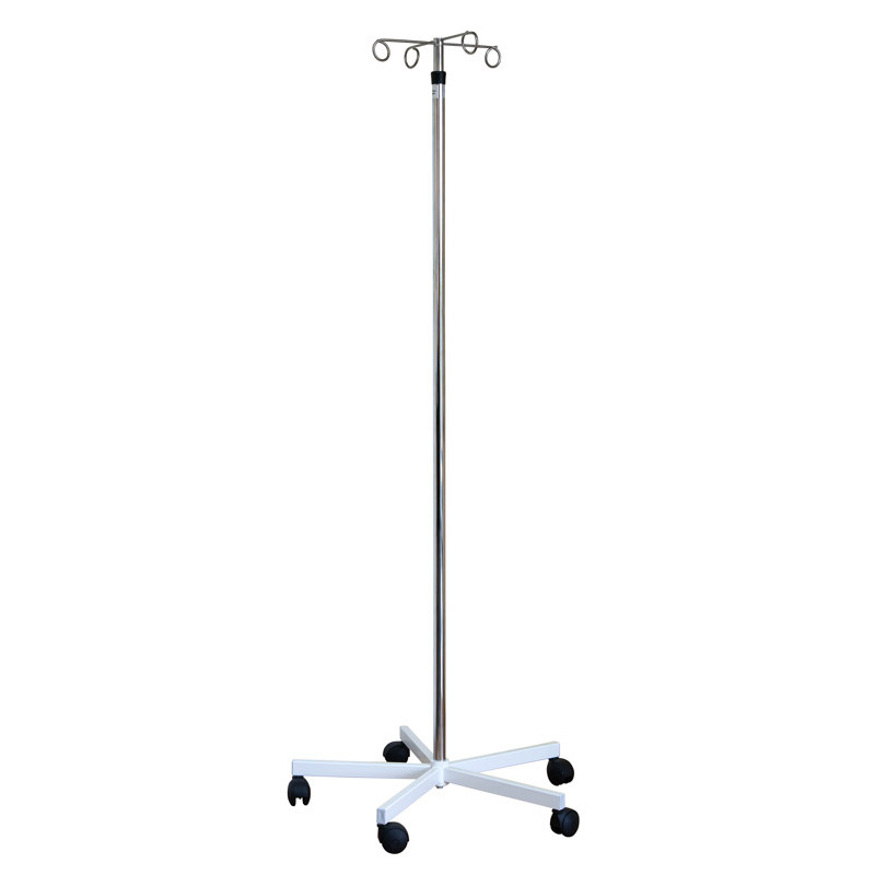 - Cztery uchwyty do płynów infuzyjnych, Podstawa metalowa, Koła gumowa (do twardych powierzchni, 2 koła z hamulcem)
