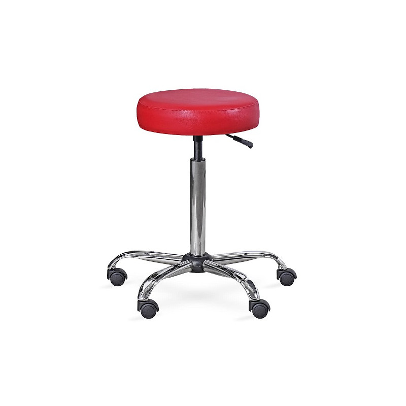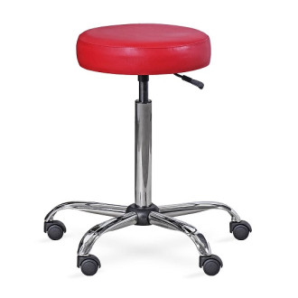 Taboret na podstwie stalowej, chromowanej, na kółkach. Siedzisko okrągłe, pokryte tapicerką tworzywową w szerokiej gamie kolorów. Pokrycie jest trwałe, pozwala na łatwe utrzymanie czystości. Dzięki zastosowanej sprężynie gazowej możliwość dostosowania wysokości taboretu do potrzeb użytkownika.