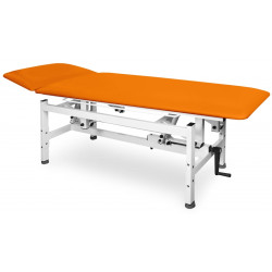 Wersje stołu JSR:JSR - regulacja wysokości manualnatu: JSR E - regulacja wysokości elektryczna za pomocą siłownika elektrycznegoJSR H - regulacja wysokości hydrauliczna za pomocą siłownika hydraulicznego Wyposażenie standardowe:• blat dwuczęściowy• podgłówek regulowany sprężyną gazową• uchwyty na pasy do stabilizacji po obu stronach leża• tapicerka skóropodobna standard line (kolory 1-25)• biały kolor stelaża• 4 regulowane stopki• korba do manualnej regulacji wysokości (dotyczy wersji JSR)• pilot ręczny do elektrycznej regulacji wysokości (dotyczy wersji JSR E)• pedały nożne do hydraulicznej regulacji wysokości (dotyczy wersji JSR H) Wyposażenie opcjonalne:• podłokietniki (PLUS)• banany rehabilitacyjne (3 szt.)• wieszak na podkład celulozowy 60 lub 70 cm• tapicerka winylowa exclusive line (kolory 101-112) • stelaż w dowolnym kolorze według symboliki RAL (oprócz koloru białego)• system jezdny z 4 skrętnymi kółkami• pilot nożny lub bezprzewodowy do regulacji wysokości (dotyczy wersji JSR E)• regulacja wysokości w zakresie od 50 cm do 100 cm (dotyczy wersji JSR E)• regulacja wysokości w zakresie od 50 cm do 98 cm (dotyczy wersji JSR) Wyposażenie opcjonalne można zamówić tylko w przypadku zakupu nowego stołu (oprócz pilota nożnego, wieszaka na podkład). DANE TECHNICZNE: