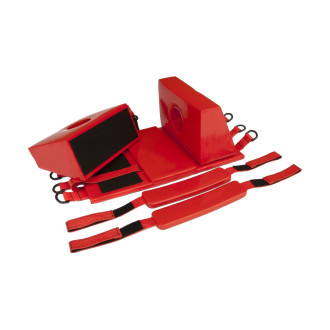 Składa się z podkładki, dwóch klocków do stabilizacji bocznej z otworami na uszy oraz dwóch pasków mocujących głowę.
