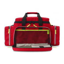 W przedniej kieszeni torby znajdują się ampularium na 30 ampułek, kieszeń wykonana z przezroczystej folii z uchwytami z gumy oraz trzy otwarte kieszenie z siatki.