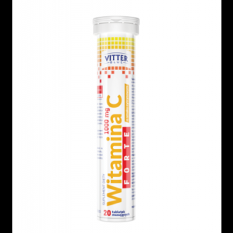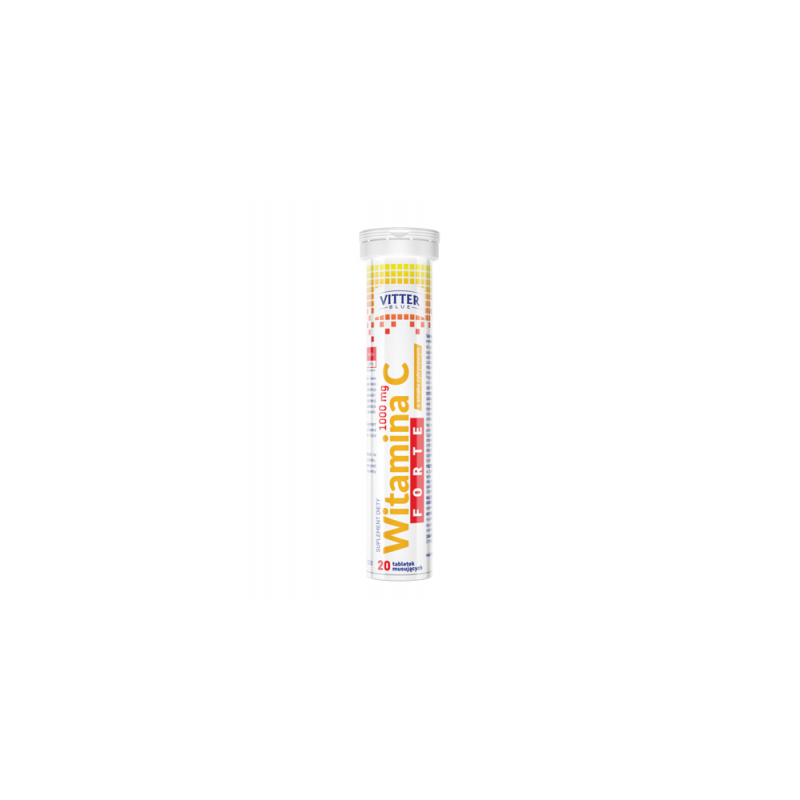 Regulator kwasowości: kwas cytrynowy; substancja wzbogacająca: kwas L-askorbinowy (witamina C); substancja słodząca: sorbitole; regulator kwasowości: węglany sodu; aromat; nośnik substancji słodzących: glikol polietylenowy; substancje słodzące: aspartam, sacharyny; barwnik: ryboflawiny. Witamina C FORTE 1000 mg suplement diety zawiera substancje słodzące. Zawiera źródło fenyloalaniny. Produkt może zawierać laktozę (z mleka).