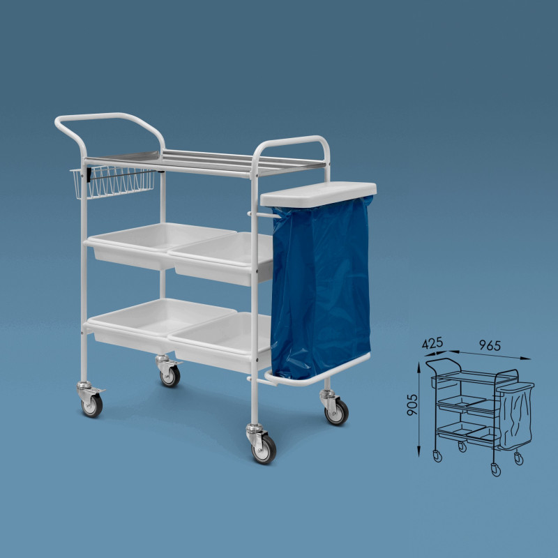 Wózek zabiegowy WZ-01 przeznaczony do szpitali na oddziały szpitalne służące w drobnych zabiegach. Wózek posiada worek na odpady,tacę nierdzewną wyciąganą, druciany kosz, trzy półki oraz cztery koła jezdne w tym dwa z blokadą.