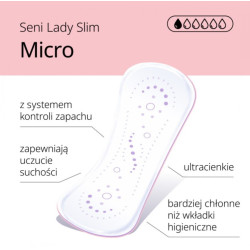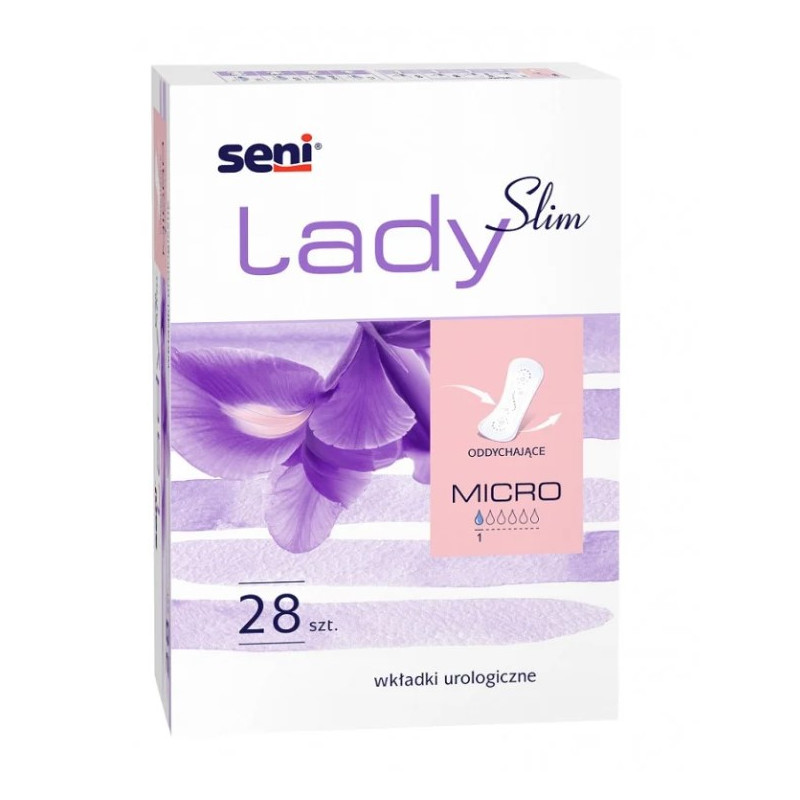 Seni Lady Slim Micro to cienkie wkładki dla kobiet, u których zdarzają się wycieki kilku kropel moczu – np. podczas wysiłku fizycznego, śmiechu, kichania lub kaszlu.