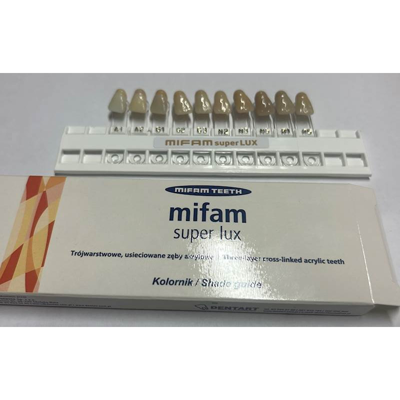 Kolornik zawiera 10 podstawowych odcieni zębów akrylowych firmy Mifam do porównania z zębami pacjenta.
